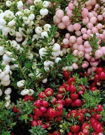 stiff, upright branches of Gaultheria mucronata are laden with these berries like gleaming china beads in colours from pearlywhite through pink to deep
